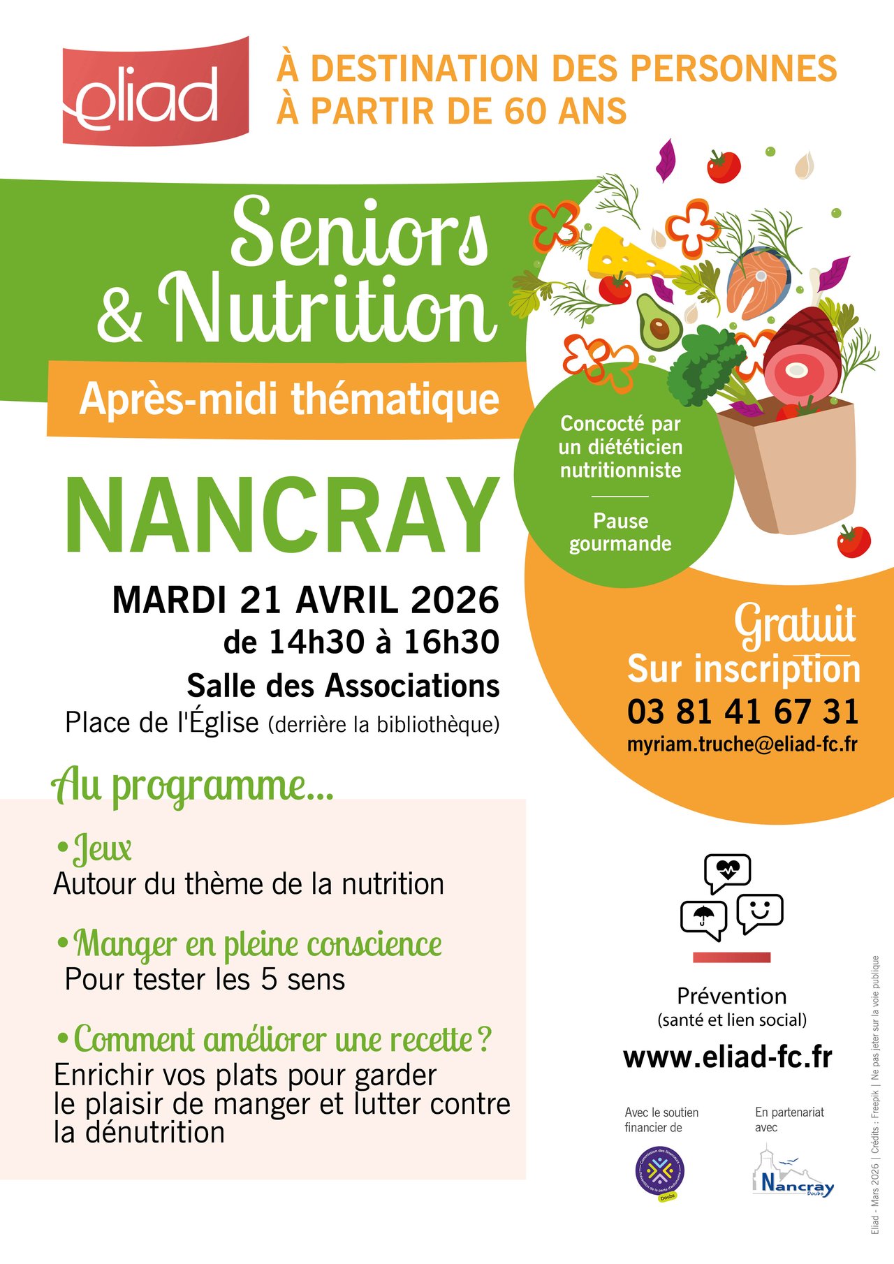 Dans le cadre de son service Prévention, Eliad organise un atelier "Seniors & Nutrition" à Nancray le 21 avril 2026.